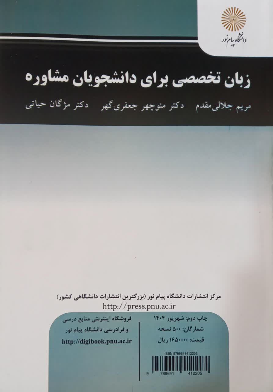 با کتاب "زبان تخصصی برای دانشجویان مشاوره"، مهارتهای زبانی و تخصصی خود را به اوج برسانید! این منبع بینظیر با پوشش جامع واژگان و مفاهیم کلیدی، شما را برای موفقیت در رشته مشاوره آماده میکند. با مطالعه این کتاب، به راحتی متون تخصصی را درک کرده و در مسیر حرفهای خود گامهای موفقیت را بردارید!
